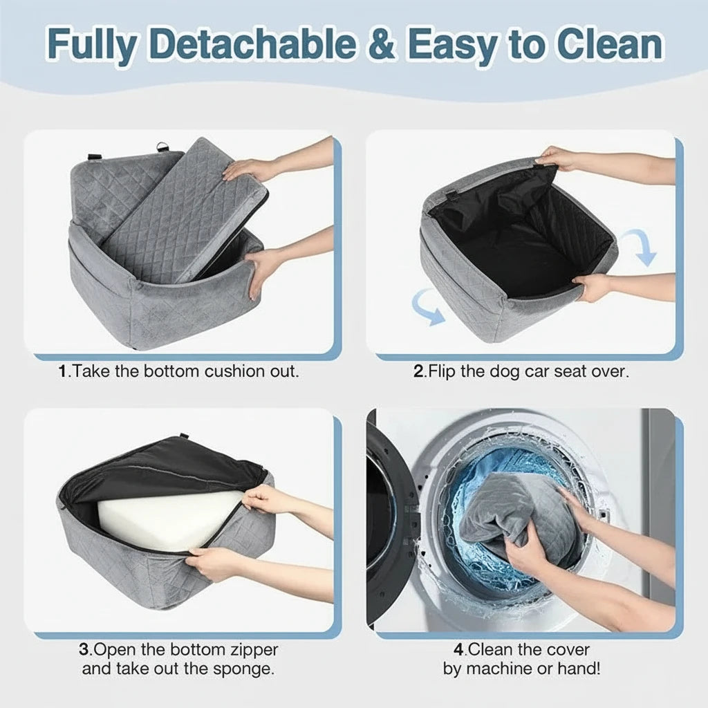 Der Sitz ist vollständig abnehmbar, maschinenwaschbar und in wenigen Sekunden eingebaut. Perfekt für tägliche Fahrten, Tierarztbesuche oder lange Reisen.