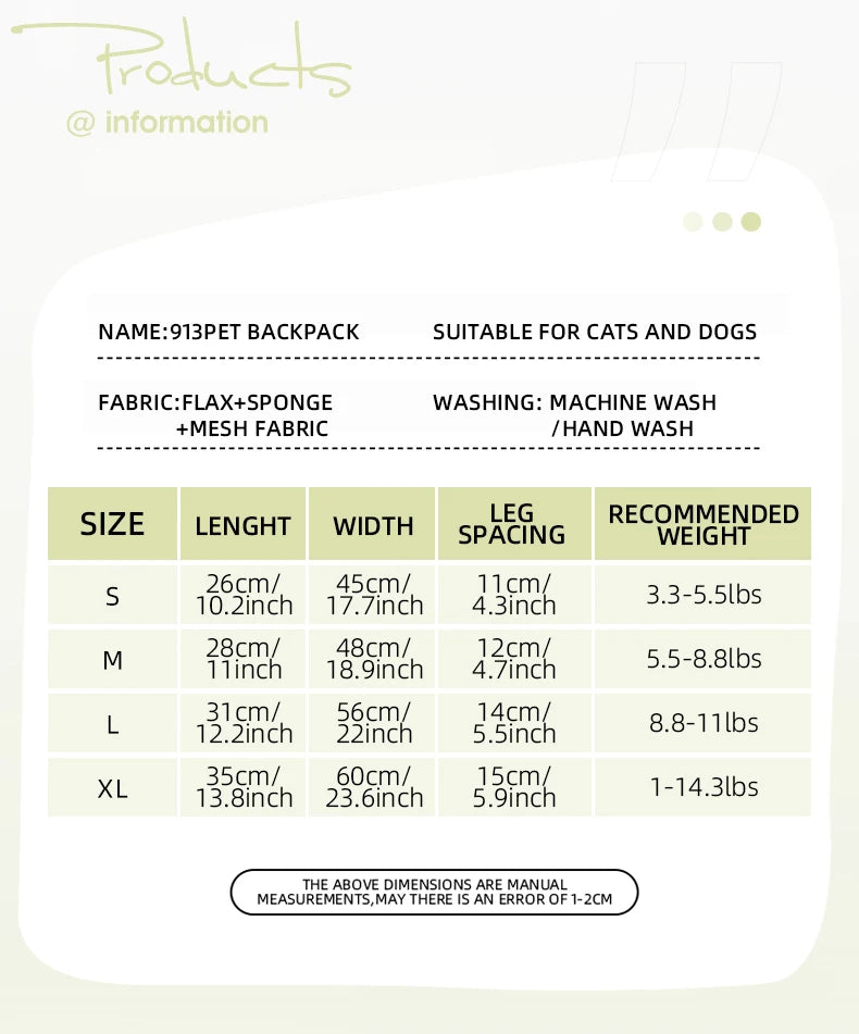 Der Rucksack besteht aus hochwertigem Leinenstoff (Flax), weichem Schwammfutter und atmungsaktivem Mesh, damit dein Tier auch bei längeren Ausflügen angenehm sitzt. Die robuste Schnalle, die feinen Nähte und das sichere Design verhindern, dass dein Haustier herausrutscht oder sich unwohl fühlt.
